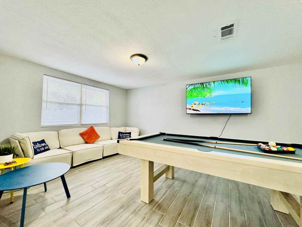 Feel at home in this stylish 3-bedroom home in Lakeland, perfect for families, couples, or groups. This home is designed for comfort, fun, and convenience and is just minutes from lakes, universities, and major attractions in Central Florida. This home features a game room with a pool table, a fully equipped kitchen, fast Wi-Fi, and a smart TV. The kitchen includes cookware, utensils, and essentials. You can also enjoy the private backyard with a fire pit and relaxing hot tub. A washer, dryer, iron, hangers, and drying rack are included. This is a pet-friendly home with a fenced outdoor space. Free on-site driveway parking is available for 2 cars, and free street parking is also available. Nestled in the heart of Lakeland, this neighborhood offers a perfect blend of convenience and tranquility, with a touch of local charm. Explore nearby attractions such as Lake Hollingsworth and the historic Downtown Lakeland area. With easy access to major highways and transportation options, getting around Lakeland and beyond is a breeze. Nearby restaurants include Subway, Pizza Hut, and McDonald’s. Quiet hours are from 10:00 PM to 8:00 AM. No parties, events, commercial photography, or smoking are allowed. If items are missing, damaged, or stained, an extra fee may apply.