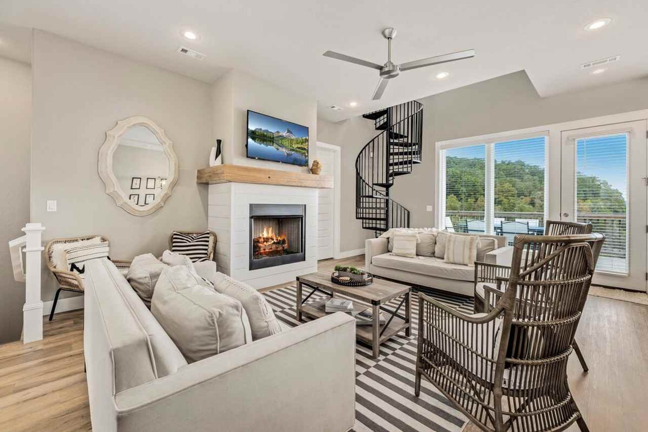 Feel at home in this 3-story lake house, perfect for vacations! This 5-bedroom lake house sleeps up to 12 guests and offers direct access to the lake via a private wood staircase. This recently built home features brand new finishes, massive windows, and modern furnishings. It includes two fully furnished back patios with a BBQ grill, a large hot tub spa, and picturesque lake views from all rooms. There are two living spaces, one with a gas fireplace, and both with large Smart TVs. The fully stocked kitchen includes all new appliances, a coffee station, and plenty of dishes and utensils for large groups. The laundry room is fully stocked with a washer and dryer. The master bedroom is on the main level and has a 65-inch Smart TV, a king-size memory foam mattress, and an en suite bathroom. The other two private bedrooms feature queen beds and share a large bathroom downstairs. A spiral staircase leads from the main living room to the top floor, which feels like an oversized loft. It includes a queen-size bedroom that connects to an open bedroom with 4 twin beds built into the walls, each with its own curtains for privacy. Past the twin beds is a spacious bathroom with a shower. Driveway parking is available for up to 5 cars. Located on a beautiful lot within a cul de sac of other lake houses, the drive to the property is gorgeous, crossing rolling hills and taking in beautiful Arkansas scenery. Access to the closest boat ramp is Hickory Creek Park Boat Ramp (6 mi), the nearest gas station and grocery store is Hometown Country Store (9 mi), the nearest restaurant is Johnson's Hickory Creek Diner (5 mi), and the nearest liquor store is Fiesta Liquors (7.5 mi). Parties or guest actions that result in disturbances, property damage, extensive extra cleaning, or smoking indoors will incur a fine of $1,000. Pets discovered at the property will incur a fine of $400. Unauthorized checkout delays will incur a fine of $100 per hour. Smoking in the home will result in a fine of $1,000 plus the cost of any smoke remediation necessary. Quiet hours are observed between 10 PM and 10 AM. If a guest wishes to go fishing, they will need to obtain an Arkansas fishing license from the Arkansas Game and Fish Commission. Water levels are subject to change at any time due to environmental factors outside of the host’s control which may impact the accessibility and appearance of the lake. Cancellations due to water levels will not be honored outside of the cancellation policy. Guests are solely responsible for preparing for their stays accordingly by checking water levels ahead of their stays. Check-in is any time after 3:00 PM.