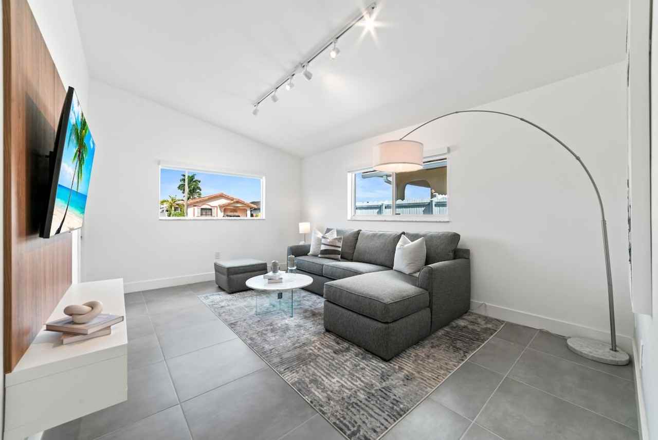 Welcome to this revamped retreat, ideal for up to six guests seeking a memorable Miami getaway. With three bedrooms and two fully renovated bathrooms, comfort and privacy are ensured. The highlight of this apartment is the backyard oasis, where you can enjoy the wonderful covered outdoor space. Step into your new retreat! This extraordinary and expansive residence beckons families and friends seeking to craft indelible memories together. With its dual-tier design and an expansive enclosed courtyard, this haven is artfully arranged. Room 1 features a queen-size bed, smart TV, two bedside tables, and an en-suite bathroom. Room 2 offers a bunk bed and smart TV, while Room 3 includes two single beds, a TV, and a bedside table. The living room is equipped with a modern sofa bed, smart TV, and coffee table. The dining area has a dining table and chairs for four. The modern kitchen is fully equipped with stainless steel appliances, a coffee maker, cookware, dinnerware, and utensils. It also features a breakfast bar with seating for four. The laundry room is equipped with a modern washer and dryer. The lavish bathrooms come stocked with all the essentials for your stay along with plenty of soft fluffy towels. Parking is available for up to four cars in the driveway. Early check-in and late checkout may be available for a cost of $75. Guests who stay beyond their checkout time without approval will be charged $100 per hour. Located in Miami, this apartment offers easy access to the vibrant city life and nearby attractions. Whether you're exploring the local dining scene or enjoying the beautiful beaches, you'll find everything you need within a short distance. The house has security cameras that cover only the exterior areas of the property, remaining on and in operation at all times for security purposes. The property undergoes rigorous cleaning and sanitization according to CDC standards. While the property is regularly treated for bugs and insects, Florida's sub-tropical climate can attract critters, so keeping doors closed is advised. Guests found smoking inside the house will be charged an extra $250 cleaning fee for odor removal. Unauthorized guests may incur a fine of $50 per unapproved guest beyond the home capacity. An extra charge of $50 will apply per unauthorized vehicle. This apartment does not include a dedicated home office set-up, but the spacious living area provides ample space for remote work if needed.