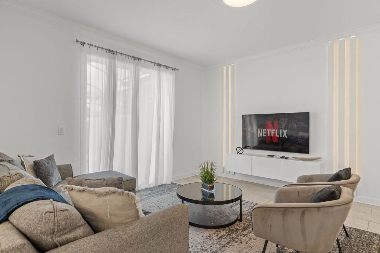 Experience ultimate comfort in this modern 4-bedroom townhome, perfect for up to 12 guests. The open-concept living, dining, and kitchen areas are ideal for gatherings. Enjoy a private pool patio and explore the top-notch amenities at Storey Lake, including pools, a lazy river, fitness center, and mini-golf. Just a 10-minute drive from Disney parks, this home offers the best resort experience in Orlando. Your dream vacation begins here! Discover the comfort and beauty of this modern 4-bedroom, 3-bathroom townhome with clean decor. The open-concept living room, dining area, and fully equipped kitchen create a perfect space for relaxation. The patio features a private heatable pool, perfect for fun and joy. The first floor has a convenient queen bedroom with an attached bathroom. Upstairs, the spacious master suite with a king bed promises restful nights. Two additional bedrooms, each with a bunk bed of two double beds, share a bathroom—one decorated in delightful Mickey and friends decor, the other with a Star Wars theme. For your convenience, there's a laundry room with a washer and dryer. Enjoy free Wi-Fi and complimentary parking. Your stay begins with a welcome kit filled with essential amenities. Replenishing bathroom and kitchen amenities is the guest's responsibility. Pool heating and barbecue grill use are available for an additional fee. Storey Lake Resort has the perfect location just 10 minutes from all major attractions and theme parks in Orlando, including Walt Disney World, Universal Resort, and Sea World. You will find fantastic resort amenities for the whole family to enjoy with a tiki bar, a resort-style pool with slides and lazy river, sports court, mini-golf, kayak, and fitness center. There are two clubs inside the property, one of them with a themed pirate pool that kids will love, just walking distance from the house. Located just off Osceola Parkway, the resort has easy access to restaurants, shopping, and supermarkets, all within a 5-minute drive. Quiet hours are between 22:00 and 8:00.