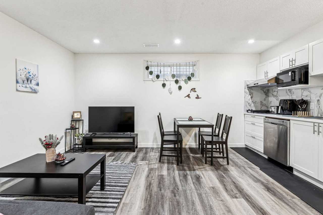 The advertised rate of C$1,817/month is the lowest available price, based on a 1 month(s) stay with a move-in date of November 16, 2026. Rates vary depending on the duration of stay, season, and other parameters. For exact pricing and additional pricing components, please visit our website and enter your desired move-in and move-out dates. The rate is applicable when billed upfront; it can be higher if billed in multiple payments. Feel at home in this stylish and cozy 1-bedroom basement suite located in Calgary’s scenic Cranston community. This suite is the ideal retreat for solo travelers, couples, or small families. This charming suite features a spacious king-size bedroom with quality linens, a full bathroom with a modern standing shower, and an open-concept living room with a fold-out sofa bed. Enjoy entertainment with a smart TV with Netflix and high-speed Wi-Fi. The fully equipped kitchen includes cookware, dishes, and appliances. In-suite laundry is available for added convenience. A pack ‘n play crib and a high chair are available for $40 each, one-time charge. Airport transportation is available for $49, one-way. Located in Calgary’s quiet, family-friendly Cranston community, this suite is steps away from Bow River trails, ideal for walks, bike rides, and views. It's also near Century Hall, offering tennis, a skating rink, and a splash pad, and 5 minutes from Seton, with shopping, restaurants, a VIP cinema, and Brookfield YMCA. With easy highway access to Banff, Lake Louise, and Kananaskis Country, it’s your perfect home base for both city stays and mountain escapes. Nearby attractions include Fish Creek Provincial Park, Bow River Pathway, Seton Urban District, Calgary Zoo and Heritage Park, Cranston Market, and South Trail Crossing. Quiet hours are between 10:00 PM and 7:00 AM. Parties, events, and smoking/vaping of any kind are prohibited in or around the property and risk a fine of $150. Outside of service animals, pets are not permitted at this property. Any evidence of pets will result in a fine. Upon departure, please ensure the home is tidied up with all garbage bagged and recycling gathered by the sink. Should the home be left in an untidy disrespectful fashion, an additional cleaning fee will be charged. Late departures will result in a fine of $150 for each additional hour the property cannot be accessed for turnover.