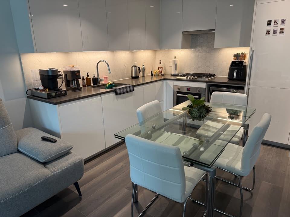 Available for Showings now! Message if you would like to view today. MOVE IN READY, home at FRASER COMMONS by Serracan! This 1 Bed 1 Bath courtyard facing home; Bosch Premium appliances w/ Gas range-top, stunning Quartz Countertops, ltalianliber Cucine Cabinetry with under-cabinet lighting, Marble-inspired backsplash, floating bathroom vanities and A/C throughout. Amenities: -Concierge -Fitness room -Business rooms -Multi-purpose room with kitchen -Beautiful Rooftop Terrace w/BBQ -Garden and a 1 /4 acre park for your use -Central air conditioning and heating -In-suite washer and dryer -4 burner Bosch gas range and oven -Large tub sink -Private balcony -Soft close cabinetry -Large windows for natural lighting Amenities include a private rooftop terrace, fitness centre, and exclusive park and daycare access. Convenient location and close by to Marine Gateway Canada line station. Showings available. No smoking. Pet friendly. Looking for long term tenants. Tenant insurance required