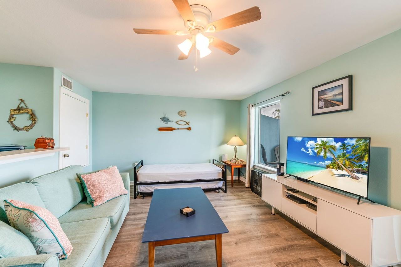 Escape to this charming 1-bedroom condo in Corpus Christi, just 2 minutes from Whitecap Beach, and feel at home. This cozy space is walkable to Michael Ellis Beach and Whitecap Beach. This coastal retreat features a fully equipped kitchen with modern appliances and a coffee maker. The inviting living room offers plush seating, a flat-screen TV with cable, and patio doors leading to a spacious balcony with extra seating. A twin-size daybed with a twin trundle provides extra sleeping space. The spacious bedroom is outfitted with a queen-size bed, soft linens, plush pillows, and room-darkening shades. The clean and modern bathroom includes fresh towels, essential toiletries, and a hairdryer. Stay connected with high-speed Wi-Fi throughout the condo. Pets are welcome with prior approval and a fee of $120 per stay per pet. Nestled in the vibrant coastal city of Corpus Christi, this apartment at Leeward Isles offers an unparalleled blend of seaside serenity and urban excitement. Padre Island National Seashore, Mustang Island State Park, and the Texas State Aquarium are all within easy driving distance. Enjoy local restaurants like Beachfront Grill, Surfside Tacos, and Coastal Cantina. Pool hours are from 9:00 am to 10:00 pm. Always supervise children and non-swimmers and swim at your own risk. Do not use the pool with open wounds or infectious conditions. Please shower before and after swimming. No diving is allowed. No glass containers are allowed. Dispose of all trash in designated bins. For stays over 7 nights, a mid-stay cleaning is required at the same cost as the regular cleaning fee.