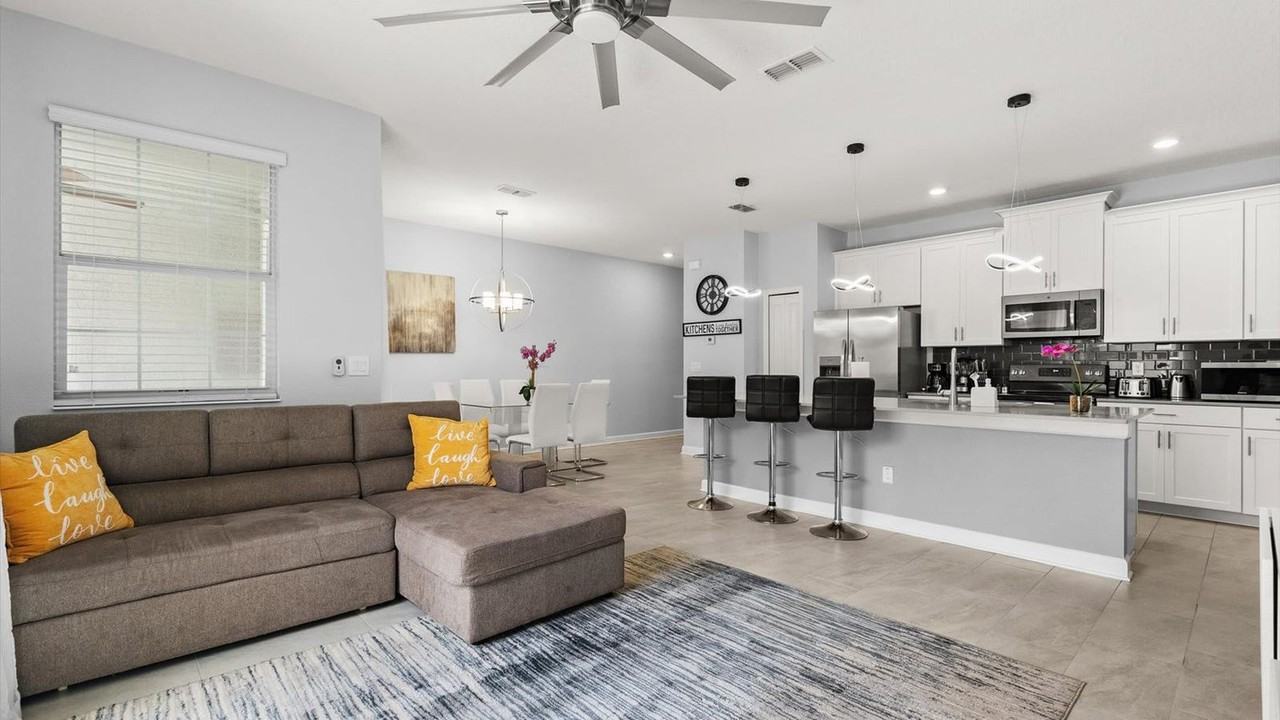 The advertised rate of $2,759/month is the lowest available price, based on a 30 day(s) stay with a move-in date of May 12, 2026. Rates vary depending on the duration of stay, season, and other parameters. For exact pricing and additional pricing components, please visit our website and enter your desired move-in and move-out dates. The rate is applicable when billed upfront; it can be higher if billed in multiple payments. Feel at home in this modern 4-bedroom, 3-bath townhome at Storey Lake, just minutes from Disney. This spacious home is perfect for up to 12 guests. This home offers a fully equipped kitchen with stainless steel appliances and a breakfast bar, a cozy living space with a Smart TV and comfortable seating, and a dining room that seats your whole group comfortably. Enjoy central A/C, ceiling fans throughout, and the convenience of an in-unit washer and dryer. Towels, linens, and basic toiletries are provided. Optional amenities, including pool heating (subject to availability) and BBQ grill rental, are available upon request for an additional fee. Pets are welcome with prior approval and an additional fee. Located in Storey Lake Resort, a gated community in Kissimmee, this home is close to Universal Studios, SeaWorld, shopping at The Loop and Lake Buena Vista Factory Stores, restaurants, grocery stores, and golf. Orlando International Airport (MCO) is just a 25-minute drive away. Quiet hours are between 11 PM and 7 AM. Bringing pets to the property will incur an additional fee. Exterior security cameras are installed around the property for your peace of mind, monitoring only outdoor areas, not private spaces. Keep the thermostat at 72°F or higher to prevent freezing and maintain consistent cooling. All trash must be securely bagged and placed in the outdoor bin provided.