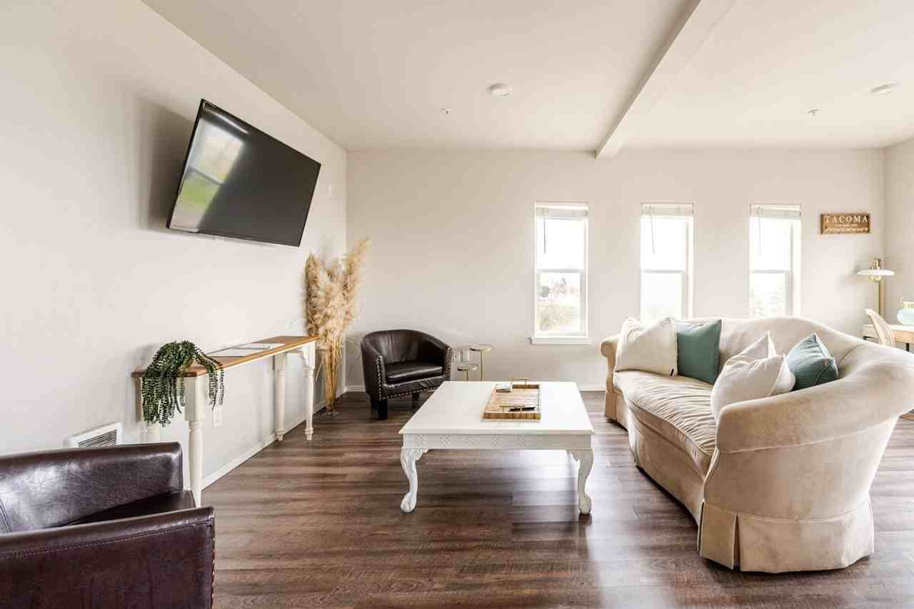 The advertised rate of $5,830/month is the lowest available price, based on a 30 day(s) stay with a move-in date of August 25, 2026. Rates vary depending on the duration of stay, season, and other parameters. For exact pricing and additional pricing components, please visit our website and enter your desired move-in and move-out dates. The rate is applicable when billed upfront; it can be higher if billed in multiple payments. Experience the charm of Tacoma with this top-floor corner condo offering stunning views of Commencement Bay and the Tacoma skyline. Located just steps from the Tacoma Dome, this home provides a peaceful retreat on a quiet street in the Tacoma Dome neighborhood. Please note, access to this condo requires climbing three flights of stairs as there is no elevator. This spacious condo features an open floor plan with two private bedrooms and 1.5 baths, comfortably accommodating up to four people. Enjoy plush down bedding with one king-size and one queen-size bed, spacious closets, and tasteful decor. The kitchen boasts sparkling white granite countertops and stainless steel appliances, fully stocked with everything you need from cookware to coffee. The bathroom is equipped with towels, shampoo and conditioner, and all basic toiletries. Additionally, there is an in-unit washer and dryer, complete with laundry detergent, dryer sheets, and an iron and ironing board. Reserved parking is included with your stay, ensuring convenience and ease during your visit. Nestled in the Tacoma Dome neighborhood, this condo offers breathtaking views of Commencement Bay and the downtown Tacoma skyline. Its prime location places you steps away from the Tacoma Dome and provides easy access to the vibrant city life of downtown Tacoma. The building features controlled access with a keyless lobby and condo door, making entry simple and secure. Relax in the living area with some popcorn and Netflix, or enjoy a meal at the dining table for four.