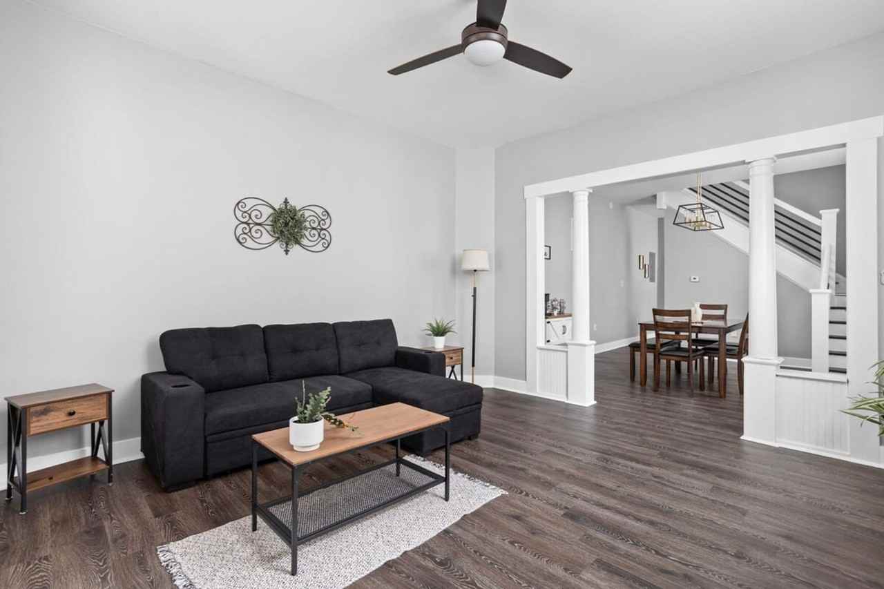 Feel at home in this freshly renovated duplex for five in a vibrant neighborhood, the perfect base for your Indianapolis stay. This modern 2-bedroom home is perfect for up to 5 guests and features a fully equipped kitchen with a coffee bar, in-unit laundry, a full bath, and an extra half bath. Relax on the comfy couch and stream your favorite shows on the smart TV. Two cozy bedrooms come with premium linens and sound machines to help you sleep peacefully. Enjoy meals in the spacious dining area or relax in the open backyard. You have access to a private parking area behind the property that can fit 1-2 cars, as well as street parking directly in front of the property. Minutes from downtown and main attractions, this apartment is conveniently located near Lucas Oil Stadium and Gainbridge Fieldhouse. The neighborhood itself is still undergoing development, and while this house has been fully renovated, other homes nearby have not been. The neighborhood is quiet and very welcoming. Indianapolis Zoo, Indiana Convention Center, and Indianapolis Motor Speedway are a short drive away. Parties are prohibited, and there is a $2000 party fee. Smoking is prohibited, and there is a $1000 smoking fee. All damages must be reported promptly and are to be paid by the guest. All trash is to be taken out and disposed of, and the dishwasher started. The maximum property capacity is 5, and no unregistered guests are allowed. This property is equipped with exterior security cameras located at the main entrance and backyard. These are motion activated and can be remotely monitored to ensure a secure and comfortable stay. Additionally, there is a Minut sensor inside the home in the main living area that tracks sound levels and smoke detection but does not record audio. Tampering with cameras or the sensor will result in additional fees. Registration Number: SRP-000559