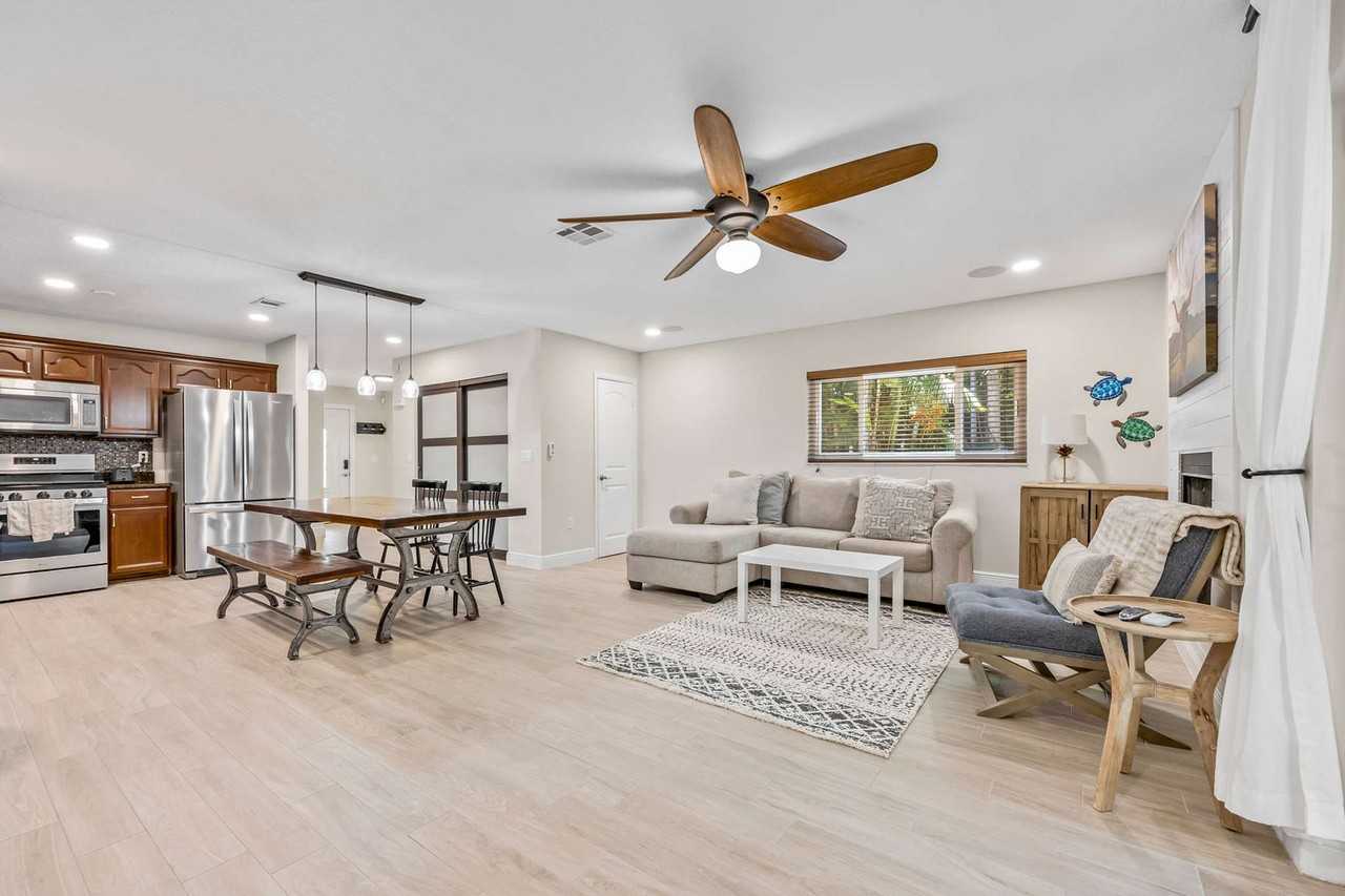 Discover the perfect Cocoa Beach retreat in this beautifully updated 2-bedroom, 2.5-bath townhome, ideally situated just two blocks from the beach and in the heart of downtown. This modern two-story haven offers everything you need for a relaxing and adventurous stay. Take a leisurely stroll to the beach to soak up the sun or catch a rocket launch, then walk to the nearby restaurants and bars for a taste of local flavors. With the river just minutes away, you can easily embark on a kayak tour to spot dolphins, manatees, and vibrant birdlife. After a day of exploration, unwind on the screened-in back patio and fire up the grill for a cookout. Plus, enjoy easy access to Port Canaveral, Kennedy Space Center, and Orlando, all just a short drive away. This two-story townhome is a blend of modern elegance and beachside charm. With two spacious bedrooms, each with its own en-suite bathroom, and an additional half bath, this home provides ample space for a comfortable stay. The living area is bright and welcoming, featuring stylish decor that creates a relaxing ambiance. The open-plan design connects seamlessly to the fully equipped kitchen, making it perfect for entertaining or enjoying a quiet night in. Each bedroom is designed for comfort, with plush bedding and modern amenities. The master bedroom boasts a king-size bed and an en-suite bathroom, while the second bedroom offers a king and queen bed and its own private bath. Step outside to the screened-in back patio, where you can enjoy the fresh air without worrying about bugs. The patio is perfect for hanging out while you cookout on the grill. High-speed Wi-Fi and flat-screen TVs ensure you stay connected and entertained, while the washer and dryer add to the convenience. Onsite parking is available for easy access. While we love all furry friends, only dogs are allowed at this property, with a fee of $100 per pet per stay. Cocoa Beach is quiet and relaxing but filled with plenty of opportunities for fun and excitement. It's an area perfect for those looking for a peaceful yet fun escape. The townhome is located just steps away from the beach where the waves and the sand are waiting for you to enjoy. Take a walk to downtown Cocoa Beach, with many options for restaurants, bars, and shops, you can count on leaving your car parked during your whole stay. Or go on a short drive to the Kennedy Space Center to witness the history of NASA or visit the Brevard Zoo, approximately 25 minutes away for an unforgettable animal experience. This also makes a great spot for a pre and post-cruise destination. Digital locks let you arrive and check yourself in, but assistance is available if needed. Message through the app for any inquiries during your stay, or call the provided number for urgent matters. Mailbox access is not available for guests. The fireplace and balcony patio over the garage are not for guest use. All reservations require either a refundable security deposit or the purchase of a damage waiver. High-speed Wi-Fi and flat-screen TVs ensure you stay connected and entertained.