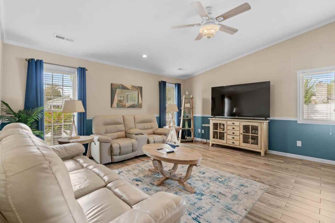 Welcome to this beautiful two-bedroom home located in the heart of Surfside Beach, SC. This spacious open floor plan offers a comfortable and inviting living space with luxury finishes throughout. Enjoy the private swimming pool with optional heating, a gas grill, and an optional luxe golf cart. It's perfect for relaxing and unwinding after a long day at the beach. Just a golf cart ride from the beach, you can easily access the nearby Surfside Pier or take a leisurely stroll along the shore. Entering through the main door, you will find a spacious living room with gorgeous theater-style leather reclining couches and a 75" HD smart TV for all your entertainment needs. The living room opens to the large fully equipped kitchen with new stylish black stainless appliances. Step out the side door and you are immediately poolside! The two bedrooms each have a large closet, a queen bed, pool views, and deck access through sliding glass doors. There is a Jack and Jill style bathroom with double vanities and a toilet off the master bedroom and a separate vanity and toilet accessible from the hallway between bedrooms. There is also a huge shower with a rainfall shower head and gorgeous floor-to-ceiling tile. The brand new fully loaded 4-seat luxury golf cart with Bluetooth stereo is available for rent. Check it out in the listing pictures and just add on at check-out! We recommend renting our awesome super light and durable backpack-style beach chairs to make your stay even more enjoyable, available through a link after your booking. Located off Glenn's Bay Road, with a 30 mph speed limit making it golf cart legal, Indian Oak Lane is a quiet residential street just about 1.5 miles from the Surfside Pier. You will be within a golf cart's ride of the Piggly Wiggly grocery store, downtown Surfside with its fantastic restaurants like Surfside Pizza, Wooden Spoon Cafe, Malibu of Surfside, and many more! Continue onto Surfside Drive straight to the fabulous new Surfside Pier with its several delicious eateries close by as well. You won't have to wander far and you can park the car for the majority of your stay and golf cart the family almost everywhere! This property is non-smoking and pets are not permitted. By state law, occupancy may not exceed five, including infants and children. Check-in is from 4:00-10:00 PM and check-out is at 10:00 AM. Quiet hours are between 11 PM-7 AM as per Surfside Beach ordinance. Please consider your neighbors and keep noise to a reasonable level. Please ensure you are attending the gas grill at all times during usage. All garbage should be firmly secured in bags and placed in the trash can inside the enclosed pool patio area. No fireworks or flammable materials or any other articles deemed hazardous are permitted. Please limit parking to the driveway only.