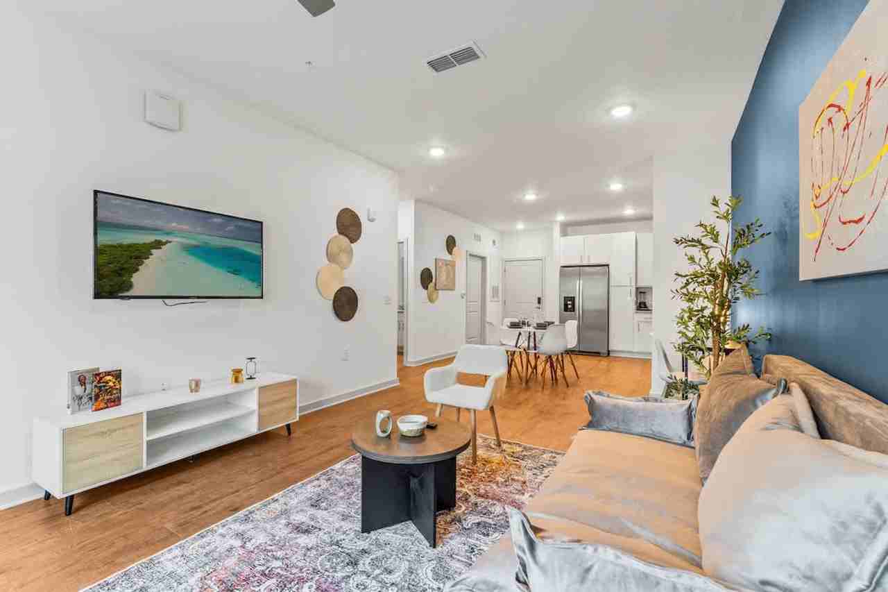 Feel at home in this perfectly located apartment, just 10 minutes from Orlando's magical parks. This cozy space sleeps four people and offers all the comforts of home. The apartment features a living room with a queen-size sofa bed and a 50” smart TV. The fully equipped kitchen includes a stove, microwave, refrigerator, coffee maker, dishwasher, cookware, utensils, and a dining table with four chairs. There is also an in-unit washer and dryer for your convenience. The bathroom offers a relaxing bathtub and shower, along with complimentary toiletries such as shampoo, conditioner, shower gel, hand soap, towels, and a hairdryer. Complimentary parking is available for up to three cars. An EV charger is available for electric vehicles, subject to availability, and a fee applies when used. A Pack 'n Play crib is provided with a crib sheet and blanket. Enjoy a peaceful retreat that's still close to the action. Disney Parks are just 10 minutes away, including Magic Kingdom, EPCOT, Animal Kingdom, and Hollywood Studios. Universal Studios is about 20 minutes away, home to The Wizarding World of Harry Potter. You'll also find vibrant shops, restaurants, and bars close to the property, many within walking distance. Pets are welcome, but some breed restrictions apply. Quiet hours are between 10 PM and 8 AM.