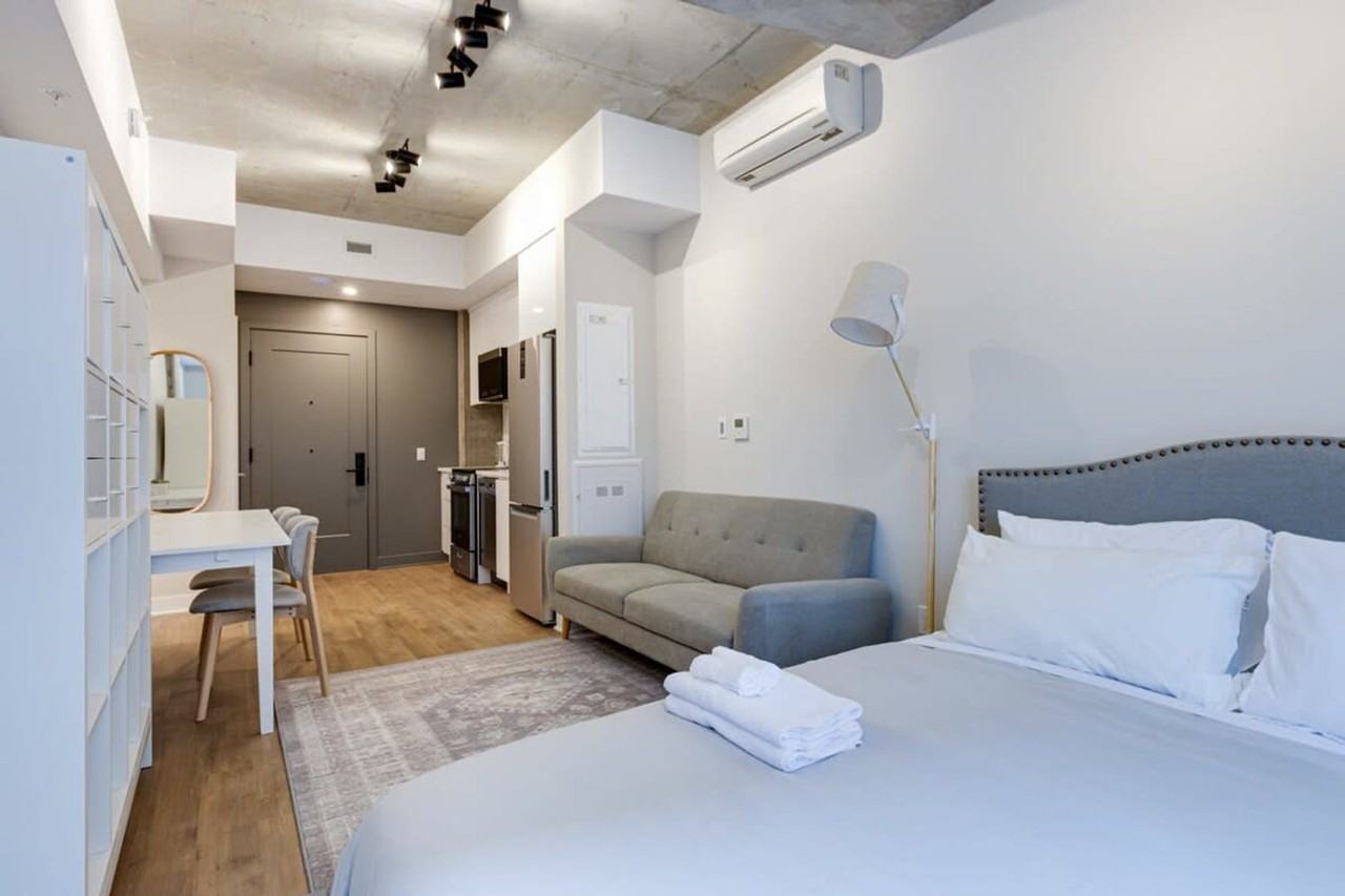 The advertised rate of C$2,497/month is the lowest available price, based on a 1 month(s) stay with a move-in date of June 9, 2026. Rates vary depending on the duration of stay, season, and other parameters. For exact pricing and additional pricing components, please visit our website and enter your desired move-in and move-out dates. The rate is applicable when billed upfront; it can be higher if billed in multiple payments. Feel at home in this newly furnished studio apartment located on the 4th floor of a building with an elevator in the heart of Montreal, perfect for 2 guests. This apartment features new furniture, a fully stocked kitchen, some complimentary coffee and tea, a smart TV to stream your favorite shows and movies, high-speed Wi-Fi, and a washer and dryer. The building offers a shared rooftop patio with a 6-person sauna, open from 6 am to 10 pm. A baby crib is available for an additional fee, subject to limited quantities. Pets are accepted at our discretion, and for a fee. The Old Port of Montreal is widely known as one of the prime locations to visit. The cobblestone streets add a layer of authenticity to the old town area, where you can find some of the best restaurants, coffee shops, bars, and tourist attractions in the city. The downtown area, Griffintown, and the Lachine Canal are also all within a 5-minute walk. This apartment is within walking distance to many shops, restaurants, bars, and cafes, a 5-minute walk to Old Montreal, a 10-minute walk to Notre-Dame Basilica, a 15-minute walk to Bell Center, a 10-minute transport to downtown Montreal, a 5-minute walk to Square Victoria Metro Station, 1 minute away from many buses, 30 minutes to and from the airport, and a 2-minute walk to IGA grocery store. Quiet hours are between 10:00 pm and 8:00 am. A maximum of 2 people are allowed to stay in the apartment. No parties and no smoking are allowed inside the apartment. Be mindful of the neighbors. The building is equipped with security cameras in the common area hallways, stairwells, and entrances. All guests must adhere to building policies, rules, and general maintenance requirements. You must fill out the check-in form prior to your arrival.
