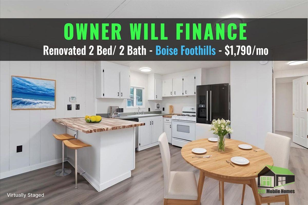 Owner Will Finance The House Lot is Rented. Total payment for home and lot is $1795 Updated 2 bed 2 bath home located in the Boise Foothills in the Floating Feather Mobile Home Park. The home is for sale-with avail owner financing. Mortgage with minimum down is: $710/mo Lot Rent is $1085/mo Get pre‑approved for owner financing. It’s free, takes 2 minutes. http Apply BoiseMobileHomes com Questions? Call/text Seller 208-340-8399 Welcome to your new home in beautiful Garden City, Boise, Idaho! This charming property offers a cozy space perfect for those seeking comfort and convenience while enjoying the vibrant local atmosphere. Nature lovers will appreciate being within walking distance of Stephen C. Guerber Park and the Ada/Eagle Bike Park, providing plenty of recreational opportunities. Utilities include central heating, air conditioning, and a ceiling fan for your comfort. Fully Fenced Yard with garden...