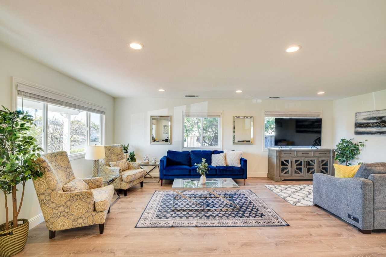 Feel at home in this Santa Clara home, ideal for work trips, offering 3 bedrooms and 2 bathrooms. Just 3 steps are required to enter this single-story home. This home features a 65" Smart TV, 2 dining tables, a foosball table, and a converted garage space with a treadmill, adjustable desk, and chair. The kitchen is equipped with a refrigerator, microwave, stove/oven, dishwasher, Breville coffee maker and coffee grinder, toaster, electric kettle, cooking basics, dishware/flatware, and spices. You'll also find a washer/dryer with detergent provided, an iron and board, linens and towels, trash bags and paper towels, complimentary toiletries, a hair dryer, a high chair, children's car seats, a booster seat, and a baby bouncer. Driveway parking is available for 2 vehicles, and free street parking is available for 2 vehicles on a first-come, first-served basis. Located just 1 mile from Levi’s Stadium and the Santa Clara Convention Center, 'Armour Valley House' is perfect for football fans and business travelers. Explore California’s Great America or hike the Baylands Nature Preserve. This property features 1 exterior security camera located at the front door facing the entryway, which records video and audio when motion is detected. There is no air conditioning. No pets are allowed. No smoking, events, parties, or large gatherings are permitted. Includes 3 laptop-friendly desks and free Wi-Fi.