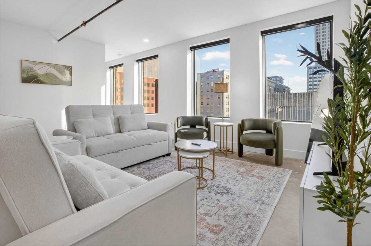 Feel at home in this modern 2-bedroom industrial loft in the historic Beacon Building, just one block from the BOK Centre. Enjoy skyline views and 12-foot ceilings in this spacious apartment. The loft features 12-foot ceilings, large windows, and exposed steel accents, creating an airy, industrial-modern vibe while maintaining the building’s timeless elegance. The open and bright living area features a Smart TV and fast Wi-Fi. The kitchen is fully equipped for cooking. Both bedrooms offer plush beds with high-quality linens. You’ll also have a combo washer/dryer and central A/C and heat. Paid parking is available for $10 per night on weekdays and $15 per night on weekends in a secure, open lot right next to the building. You’re in Downtown Tulsa’s Entertainment District, surrounded by art, culture, and great food. The BOK Center is one block away. Cain’s Ballroom is about 13 minutes walking or 3–4 minutes driving. Cox Convention Center is 3 blocks away. Tulsa Performing Arts Center is an 8-minute walk. Tulsa Club Hotel (Chamber Restaurant) is 3 blocks away. The Vault, Juniper, Elgin Park Brewery, Fassler Hall, and Antoinette Baking Co. are all nearby dining favorites. Philbrook Downtown, Woody Guthrie Center, and Greenwood Rising Museum are cultural highlights close by. Guthrie Green, with live events and markets, is a 10-minute walk. The Gathering Place, an award-winning riverside park, is a 10-minute drive. A $150 penalty will be imposed if the camera is disconnected, tampered with, or relocated from its original position.