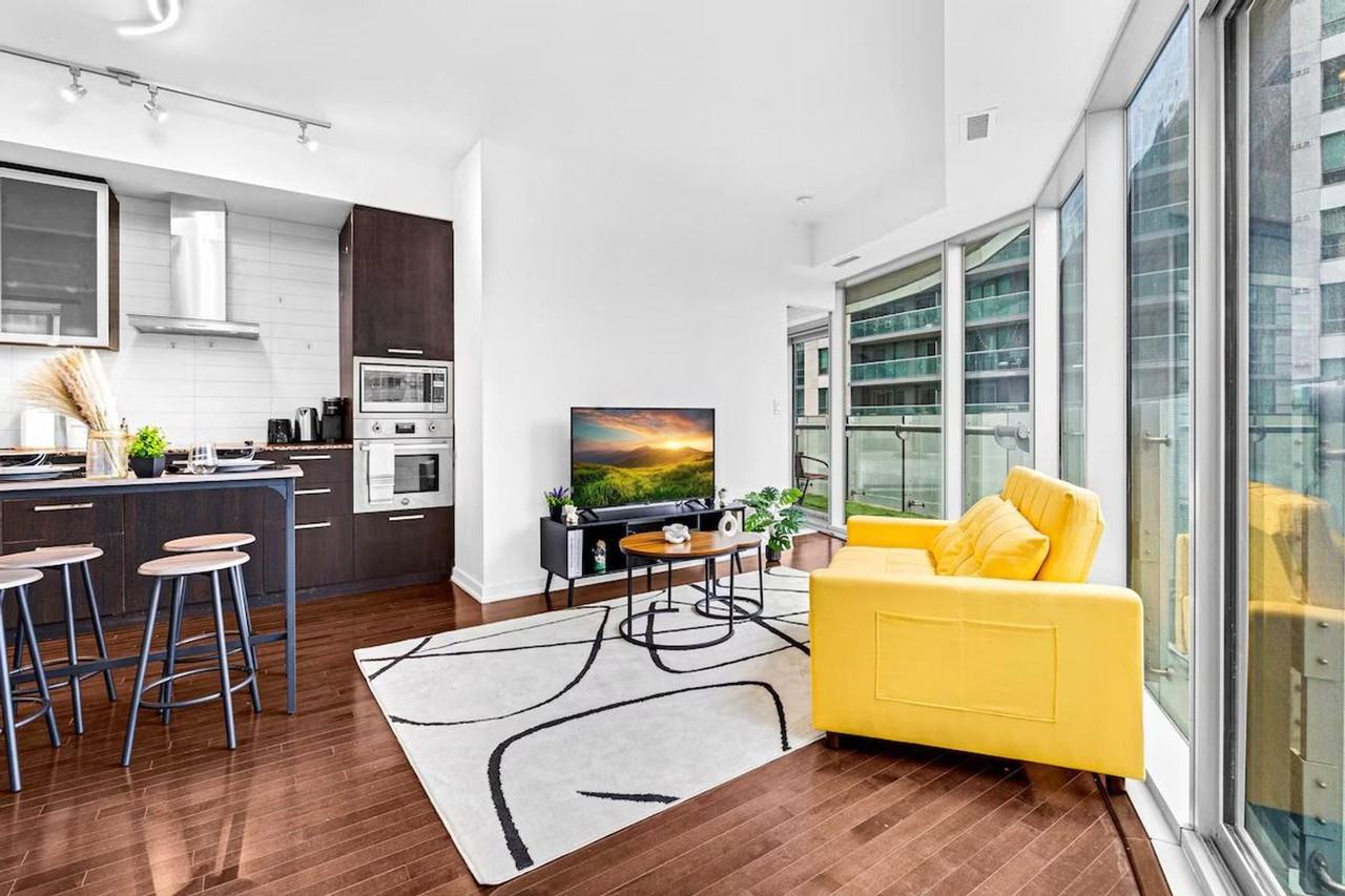 The advertised rate of C$22,777/month is the lowest available price, based on a 30 day(s) stay with a move-in date of May 15, 2026. Rates vary depending on the duration of stay, season, and other parameters. For exact pricing and additional pricing components, please visit our website and enter your desired move-in and move-out dates. The rate is applicable when billed upfront; it can be higher if billed in multiple payments. Welcome to your stylish home away from home! Feel at home in this bright and modern 2-bedroom condo, offering stunning skyline views from the living room or balcony. The entire condo includes two premium memory foam queen beds and one double sofa bed. Natural light fills all parts of the unit, offering beautiful sunset moments of the city. The fully stocked kitchen includes a toaster, microwave, and all kitchen essentials for fun and seamless cooking nights. The spacious living room features cozy furniture, perfect for relaxing and winding down. A 55” smart TV and unlimited high-speed internet are available for your convenience. A washer and dryer are included in the main closet. Toilet paper, garbage bags, and basic toiletries will be provided at the beginning of stays shorter than 28 days. Amenities are only accessible for guests staying over 28 days as per the building policy. Location is everything! Within a 5-minute walk from the building, you can reach the CN Tower, Ripley's Aquarium, an arcade, restaurants, and the lakeshore for lake view walks. The building also provides easy access to the Gardiner Expressway. Elevators might be slower than usual due to other apartments in the building. There is a strict no smoking and no party policy with a $1000 fine respectively. A noise monitoring device is installed in the unit that tracks volume decibels, but does not record audio to ensure privacy. Registration Number: STR-2510-FSXBPQ