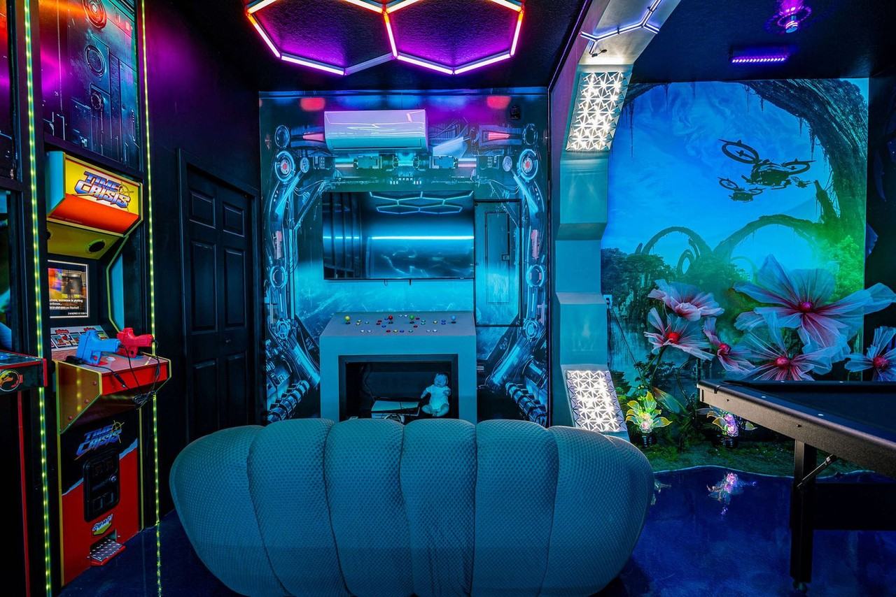 Experience a luxurious stay in this stunning 9-bedroom home in Solara Resort, perfect for up to 19 guests. Feel at home in this elegant space, just minutes from Disney. This home features a spacious open-plan living area with sophisticated furnishings and a fully equipped gourmet kitchen. Entertainment options include an Avatar-themed game room with arcade games, a pool table, and foosball. There are also four themed bedrooms, including Barbie, Lilo & Stitch, How to Train Your Dragon, and Harry Potter. Additional conveniences include complimentary Wi-Fi, a laundry room, and a welcome kit with starter supplies (replenishment of bathroom and kitchen items is the guest’s responsibility). Pool heating and barbecue use are available for an additional fee. Solara Resort in Kissimmee is centrally located in the heart of Orlando's renowned attractions. The resort boasts amenities, including a Grand Clubhouse with fitness facilities and game rooms. Nearby, you'll find shopping outlets and dining options. Quiet hours are observed between 10 PM and 8 AM.