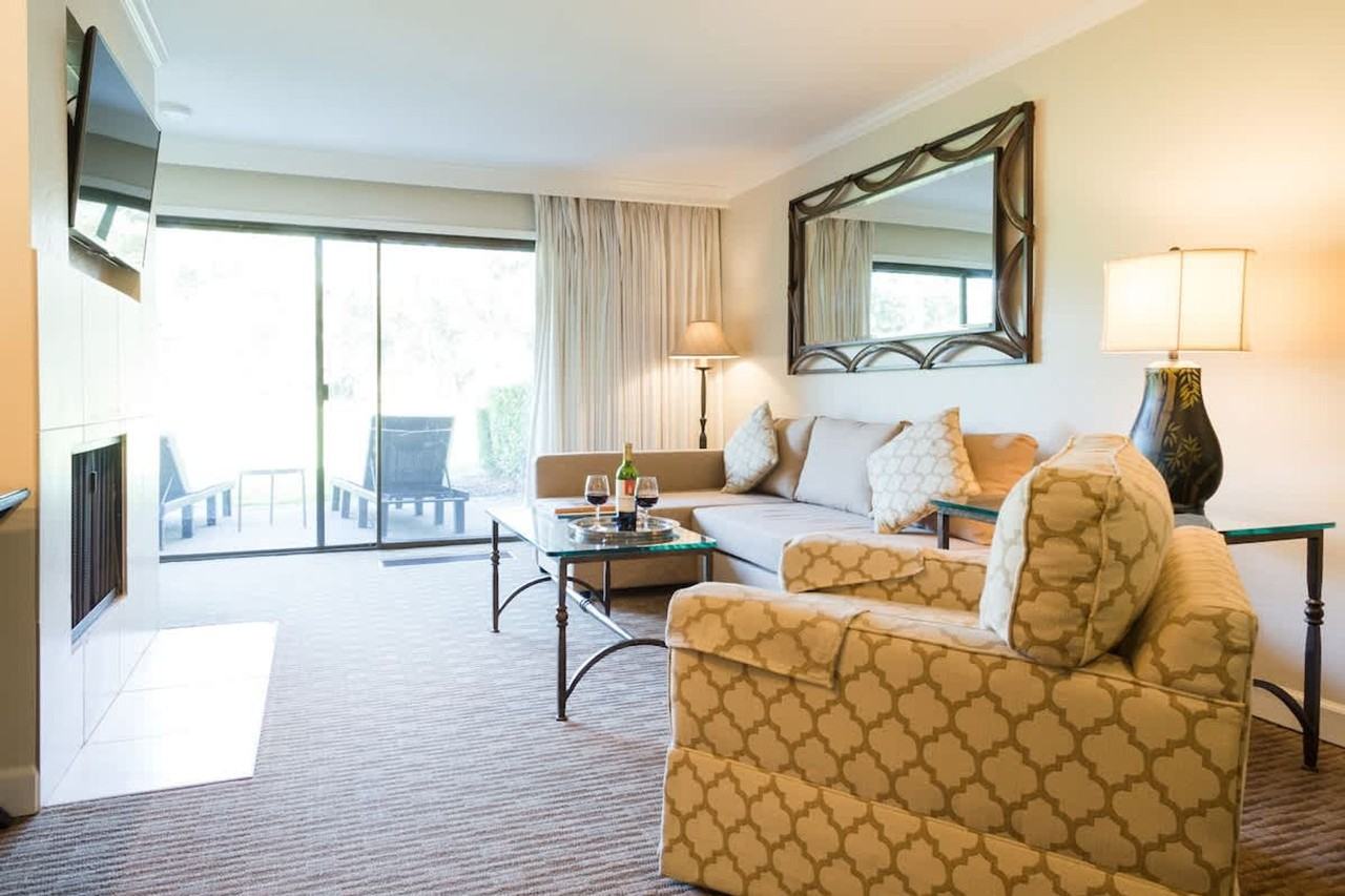 Feel at home in this elegant Napa Valley retreat, offering a blend of relaxation and adventure with scenic golf course views. This space features a king-size memory foam bed, a cozy sofa bed for two guests, and a spa-like bathroom with modern amenities and a spacious vanity. The gourmet kitchen is fully stocked for wine nights and home-cooked meals. Enjoy year-round comfort with central air conditioning and heating, and relax on the private outdoor patio overlooking the golf course. Entertainment is provided by a 55” UHD TV. Your furry friend is welcome with a fee of $100 per pet per stay. Pool access is available to the seasonal outdoor pool across the street, and free parking is provided in a private carport for two vehicles. Located in the heart of Napa Valley, this apartment is surrounded by open vineyard landscaping near the Silverado Resort. Minutes away are Yountville, St. Helena, Sonoma, and Calistoga. World-class wineries, hiking, and scenic drives await. Top restaurants and bars are steps away, and a restaurant list is included in the welcome binder. Quiet hours are after 10 PM. No smoking is allowed. Please keep pets off the bed to maintain our pristine space. Includes fast Wi-Fi and a dedicated workspace.