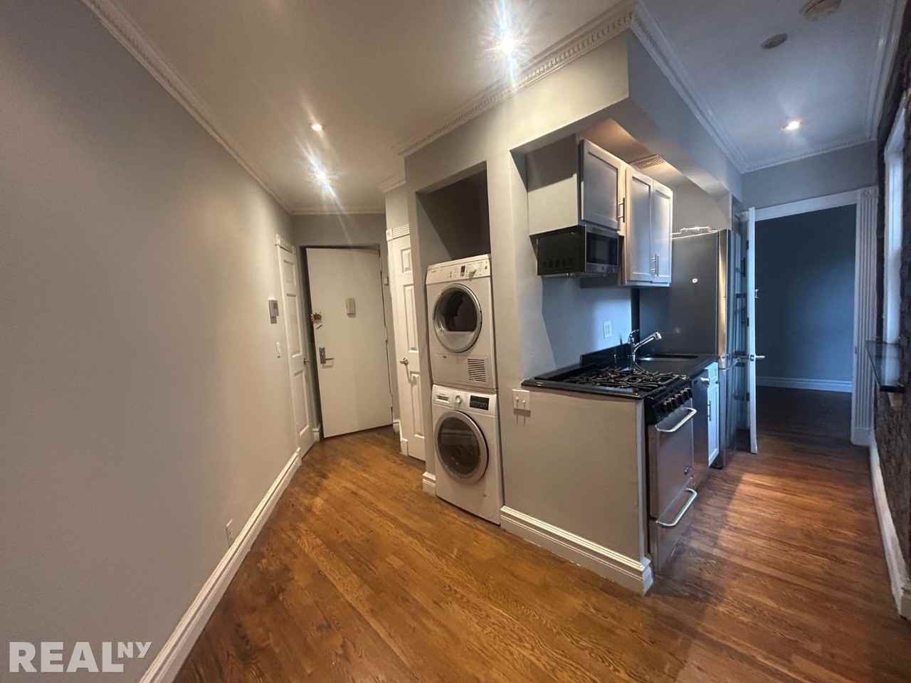 Welcome to this beautifully designed two-bedroom apartment, created to balance both comfort and style. Hardwood floors stretch throughout the home, bringing a warm and sophisticated feel to every room. The updated kitchen features custom cabinetry and plenty of counter space, making it perfect for cooking, entertaining, or prepping meals. The spacious living area offers lots of flexibilitywhether you want to relax, host friends, or set up a home workspace. Both bedrooms easily accommodate queen-sized beds and come with generous closet space to keep everything tidy. The renovated bathroom includes a modern shower/tub combo for added convenience. Pets are considered on a case-by-case basis. At Real New York, we strive to make your moving experience seamless. Our team of experienced agents knows the NYC market inside and out, and with access to over 1,000 exclusive listings plus every available apartment in the city, were dedicated to helping you find the perfect placewhether it's a luxury building or a classic walk-up.Fees:$20 application feeOne months rentOne month security deposit