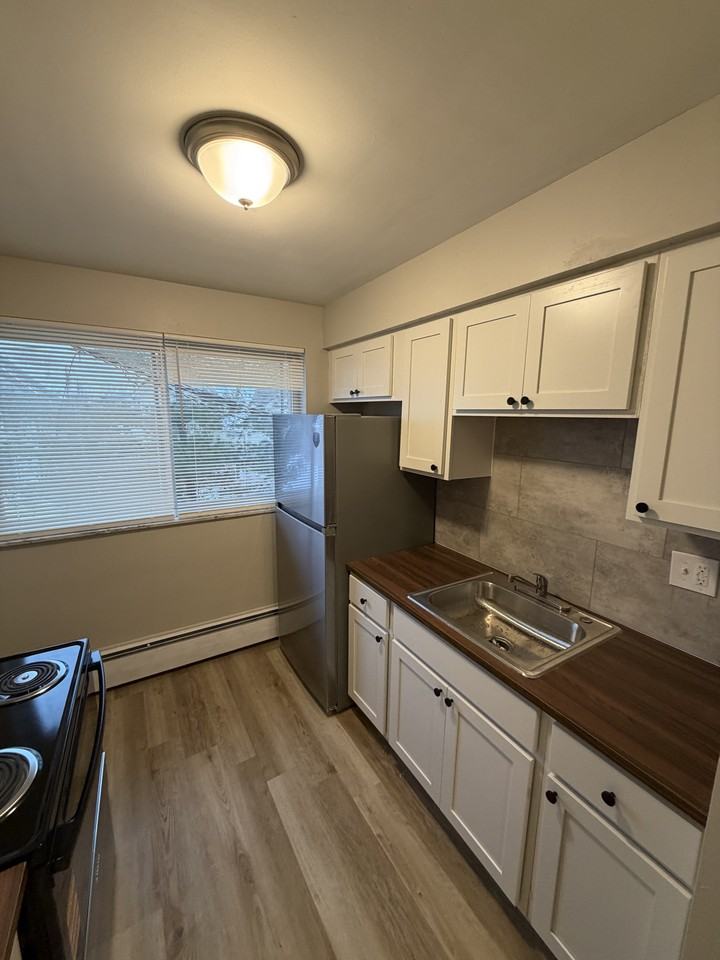 Spacious and freshly updated 1-bedroom apartment featuring brand new dark vinyl plank flooring and fresh neutral paint throughout. The kitchen includes clean white cabinetry, a full-size fridge, and stove, while large windows bring in excellent natural light. This unit includes multiple closets, including a large bedroom closet and hallway storage, giving you room to stay organized. Great for singles or couples looking for a modern and functional space. This quiet, professionally managed property offers a peaceful living environment with plenty of green space and convenient amenities. Residents enjoy a spacious grassy outdoor area, perfect for relaxing or enjoying a bit of fresh air. Dedicated off-street parking is included for all tenants. Management is highly responsive and committed to maintaining clean, safe, and comfortable units. Whether you're a student, young professional, or small family, this property provides a reliable, hassle-free place to call home.