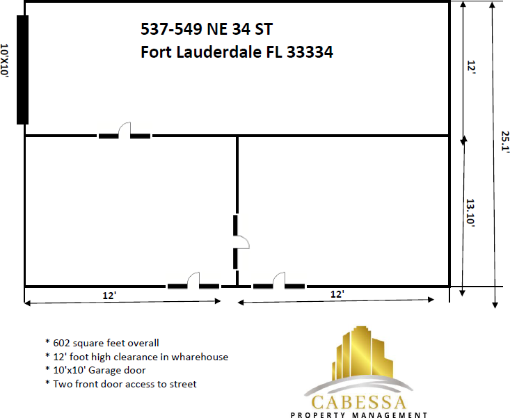 Triple Unit for Rent Size 24'x25' Three office spaces connected with a warehouse in the back. Front doors with street access One 10'x10' garage door on the side Great storage or workshop space to develop your business. Located close to Oakland Park Blvd and Andrews Ave. Two Front office spaces with attached garage. Different sizes available Bathroom on the building 24/7 access 12' high clearance 10'x10' garage door