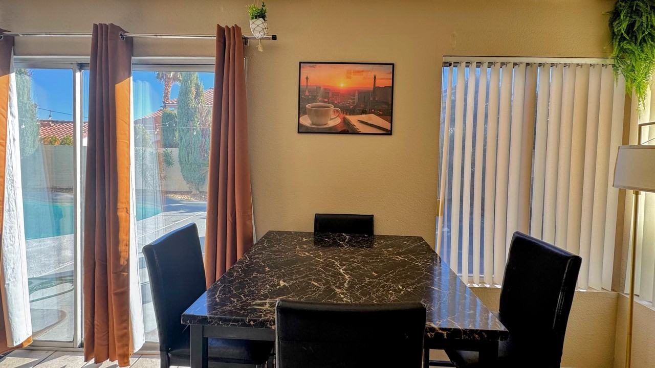 Private furnished room for rent. This recently updated Las Vegas home combines modern comfort with a cozy, welcoming vibe. Each furnished bedroom features a comfortable queen or king bed, dedicated workspace with desk and office chair, smart TV, mini-fridge, dresser, nightstand, floor lamp, door lock for privacy, and excellent WiFi coverage. One room even enjoys a private bathroom. The fully equipped kitchen includes a medium fridge, microwave, gas stovetop, oven, and dishwasher. Enjoy meals or remote work in the bright café-style dining area with individual tables and chairs. Step outside to the sparkling pool and backyard patio with comfortable outdoor seating—perfect for unwinding after a long day. Convenient in-home washer and dryer are available, and parking is easy with 2 driveway spots plus ample street parking (garage storage available for bikes, scooters, or motorcycles). Nestled in a quiet, safe, family-friendly residential neighborhood, you’re just a quick 15-minute drive from the Las Vegas Strip while enjoying peaceful suburban living $175 per week. Room rate includes all utilities, high speed WIFI, free laundry access, and 24/7 Teladoc service. Visit our website (PadSplit), or call us directly to start your application as soon as today! PROPERTY ID: 25111