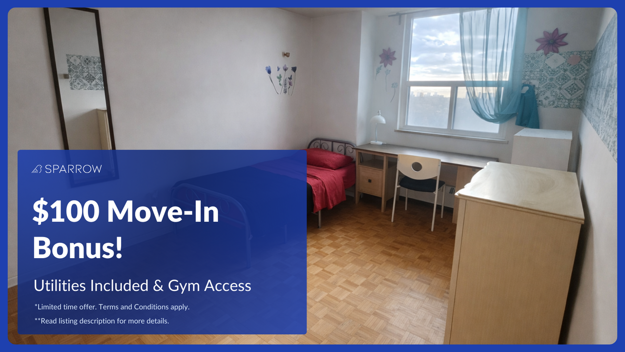 Text me at 437 291 7980 for assistance using SparrowShare Online App Request a viewing for this private room in at sparrowshare. com Private room for student in a shared 3 bedroom apartment at York Mills Road Bedroom available: 1 furnished Bedroom A: $980 Private room with Single Sized Bed (Shared bathroom) Solo student occupant only Utilities included: - Internet - Heating - Washer & Dryer Amenities included: - Gym - Elevator Shared spaces: - Bathroom - Kitchen - Dining Room - Living Room - Balcony Parking: +$150 per month Minimum Rent Duration: 4 months Payment: Security deposit after signing the agreement, then pay the 1st month's rent before move in-date Address: York Mills Rd, North York, ON M3B 1X2, Canada Nearest Universities via public transit: University of Toronto – St. George Campus - Approx 30 minutes travel time Toronto Metropolitan University (TMU) - Approx 35 minutes travel time OCAD University – Downtown Toronto - Approx 35 minutes travel time York University – Keele Campus - Approx 40 minutes travel time Nearest Landmarks (walking distance): York Mills Rd at Leslie St TTC Bus Stop Longo’s (grocery store) Mamma’s Pizza (local dining) The Second Cup (coffee) The Keg Steakhouse + Bar (York Mills Road) House Rules: - No Overnight Guests - No Smoking/Vaping/Cannabis - No Pets Additional Benefits: - Tenant Insurance Included: Renting through Sparrow includes tenant insurance at no extra cost, providing you with added peace of mind. - Credit Building: Your rent payments through Sparrow will be reported to credit bureaus, helping you build and boost your credit score over time. Disclaimer: This listing has been syndicated from sparrowshare.com, including its content, rental terms, and images. Sparrow is used to verify the identity and compatibility of those interested. The advertised property is owned and/or managed by Melvin from Sparrow Living Inc.