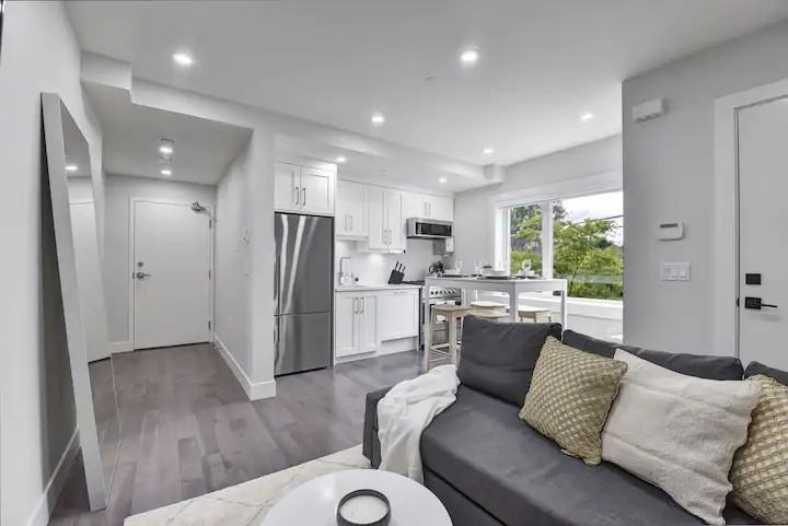 Modern and new (2022) well maintained 400 SF elevated ground floor unit with direct street access in a great East Van location, just a 5 minute walk to Joyce SkyTrain Station (Expo line), bus loop, nearby commercial amenities, Collingwood Park, and Collingwood Neighbourhood House. Features include: -Utilities included: gas, electricity, hot water, and internet -Bright and large windows -High ceilings -Designated outdoor patio area with patio set -Stainless steel appliances, with gas stove, dishwasher, in-suite laundry -Real hardwood floors throughout & tile floors in the bathroom -Smart lock on front door -Unrestricted street parking right out front -Own mailing address and private locked mailbox -93 Walk score, 85 Transit Score and 73 Bike Score (adjacent to bike path) Most furnishings in the pictures can come with the unit and can be yours to keep forever if you so choose, but we can also remove some or all of the items if you have your own furnishings. This includes a mostly complete kitchen set as well. Please indicate your preference on the application form, after the viewing. Please note that we are a small family with two young children living above. Our kitchen and living room are above your kitchen and living room, but the bedrooms are two floors above so this will limit any noise. The children are generally awake from 7:45 am to 8:00 pm everyday, and are generally out of the house from 8:30 am to 6:00 pm on school days. They are not overly loud, but they are still kids and will make some noise. Past tenants have stated that noise transfer was at a reasonable level. Credit, work, and reference checks will be completed before occupancy is granted. Move-in date: Feb 28, 2026 (Possibility of a few days earlier) Maximum 2 people occupancy. Maximum of one pet allowed. A pet deposit will be required. Minimum of a 1-year lease and first month’s rent and half a month’s rent as a security deposit due upon rental agreement signing. No smoking or subletting. Feel free to contact us if you have any questions as well.