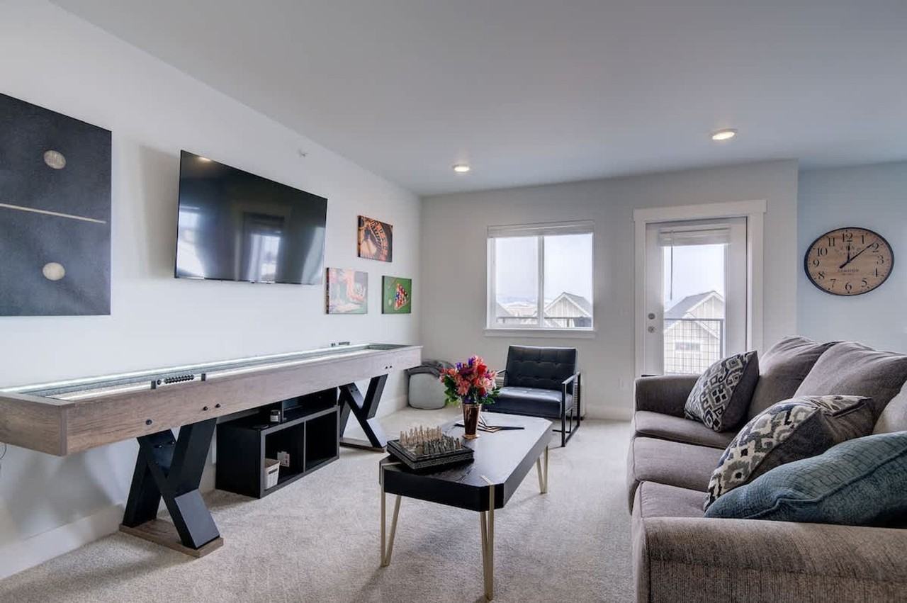 Experience Bozeman like a local in this centrally located condo, offering easy access to downtown, the hot springs, and the surrounding mountains. Located on the top floor of one of Bozeman's newest neighborhoods, this lavish 2-bedroom, 2-bathroom unit comfortably accommodates up to six guests and has incredible views. Feel at home in this impeccable condo just off Cottonwood. This condo features an open floor plan designed to provide a seamless flow of space, allowing you to make the most of its generous layout. The fully stocked kitchen makes mealtime a breeze with a top-notch set of non-stick pots and pans, along with complementary cooking essentials. Enjoy the shuffleboard, smart TV, and outdoor seating on the back deck off the living room. A free assigned parking spot is available for your car in front of the unit. Located in one of Bozeman's fastest-growing neighborhoods, this condo is near parks and walking trails, along with some of Bozeman's best restaurants. Bozeman’s Gallatin Field Airport is just a 10-mile drive away. Yellowstone National Park is 80 miles away. During winter months, the lodge's proximity to Bridger Bowl Ski Area and Crosscut Cross Country Ski Area, a mere 17-mile drive, make it an ideal choice for winter sports enthusiasts. Big Sky resort is located just 45 miles away. Smoking on the premise will result in a $500 minimum fine and immediate termination of rental without refund. Registration Number: STR23-00130