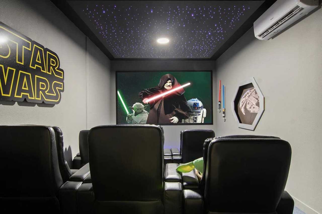 Feel at home in this renovated 6-bedroom, 5-bath villa at Storey Lake Resort, just 6 miles from Walt Disney World. This villa sleeps up to 18 guests and blends upscale finishes, interactive themed spaces, and resort-style amenities for a one-of-a-kind stay. This villa features a bright, open living room with a plush sectional and a 65” Smart TV. The chef-ready kitchen is fully stocked with stainless steel appliances, a coffee bar, blender, toaster, and all cookware and utensils. There are two private master suites, one upstairs with a spa bathroom, soaking tub, walk-in shower, and workstation, and one downstairs with Minnie & Mickey-themed decor and direct pool access. Themed bedrooms include an Inside Out glow room with a bunk bed for four and a play table, an Avatar adventure room with a Jeep-themed bed, a Harry Potter bunk room for four with magical glow features, and Moana’s island escape with tropical vibes. Enjoy the Star Wars home theater with space-inspired ceiling, private A/C, projector screen, and six leather recliner chairs, plus an arcade closet with a full-size Pac-Man arcade and other retro-style games. The outdoor area includes a heated pool and spa with sunset lakefront views, a covered patio, loungers, dining set, BBQ grill, and safety fence. Family-ready comforts include a Pack ’n Play crib, stroller, high chair, baby gates, and changing table. Optional pool heating is available for $35 per day and is required for the entire stay. Up to 2 dogs are welcome (within the insurance policy's accepted breeds) for a $150 pet fee. Located in Storey Lake Resort, this villa is just a short distance from Orlando's main attractions: 6 miles from Walt Disney World, 15 miles from Universal Orlando, and 11 miles from SeaWorld Orlando. Shopping is convenient with Target, Publix, Walmart, and Premium Outlets within 3 miles. The villa is also surrounded by family dining, attractions, and golf. Parties are strictly prohibited, and a $1,500 penalty fee will be charged for any violations or reported parties. Guests are responsible for refilling the BBQ propane tank during their stay. Please keep pets leashed outside, never leave them unattended in the home unless crated, and clean up after them.
