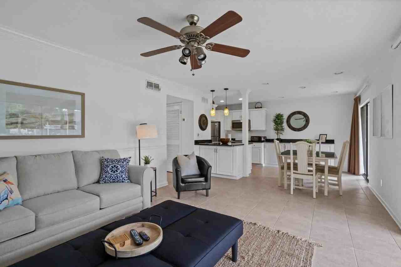 Feel at home in Kokomo, a relaxing ground-floor 2-bedroom, 2-bathroom condo nestled in the heart of Seascape Golf and Beach Resort in Miramar Beach. This spacious retreat comfortably sleeps up to 9 guests and offers everything you need for a memorable stay on the Emerald Coast. The primary bedroom features a king bed, while the guest bedroom offers a full-over-full bunk with a trundle, ideal for kids or extra guests. A queen sleeper sofa in the living room with a 3-inch memory foam topper ensures everyone rests comfortably. A pack-n-play is also provided for little ones. The fully equipped kitchen includes everything needed for easy meals at home, from cookware and utensils to coffee, condiments, and cleaning supplies. You'll also find thoughtful touches like beach chairs, towels, and toys to make beach days effortless. At Seascape Resort, you'll enjoy pools, tennis courts, a championship golf course, and exclusive discounts on on-site activities such as parasailing and kayaking. Gold's Gym access is also available for guests who want to stay active during their stay. Two parking passes are included. Located just a 10-minute walk from Seascape's private beach access, Kokomo places you close to all the best that Miramar Beach has to offer, including white sand shores, shopping, dining, and entertainment. Nearby spots include Baytowne Wharf, Destin Commons, and HarborWalk Village. Pets are not allowed.