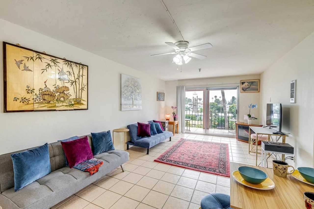 The advertised rate of $3,459/month is the lowest available price, based on a 1 month(s) stay with a move-in date of April 4, 2026. Rates vary depending on the duration of stay, season, and other parameters. For exact pricing and additional pricing components, please visit our website and enter your desired move-in and move-out dates. The rate is applicable when billed upfront; it can be higher if billed in multiple payments. Feel at home in this 2-bedroom, 2-bath vacation rental in San Diego, ideal for business travelers and medical professionals seeking an extended home base. This single-story condo offers step-free entry via the community elevator. This condo features a private balcony, a smart TV, and a dining table. The kitchen is equipped with a refrigerator, microwave, dishwasher, and stove/oven, along with a hot plate, toaster oven, and Keurig (starter pods provided). Cooking basics and dishware/flatware are also provided. Additional amenities include free Wi-Fi, central heating, ceiling fans, and clothes hangers. Trash bags and paper towels are also available. Pets are welcome with a fee of $80 (plus fees and taxes, 2 pets max). Parking is available in the garage (3 vehicles parked tandem), and free street parking is available on a first-come, first-served basis. Nestled in a resort-style community with soothing bay and beach sunset views, this condo lets you enjoy the best of California during downtime. It is located less than 10 miles from downtown. Quiet hours are observed from 10:00 PM to 9:00 AM. This property has ceiling fans but does not have air conditioning.