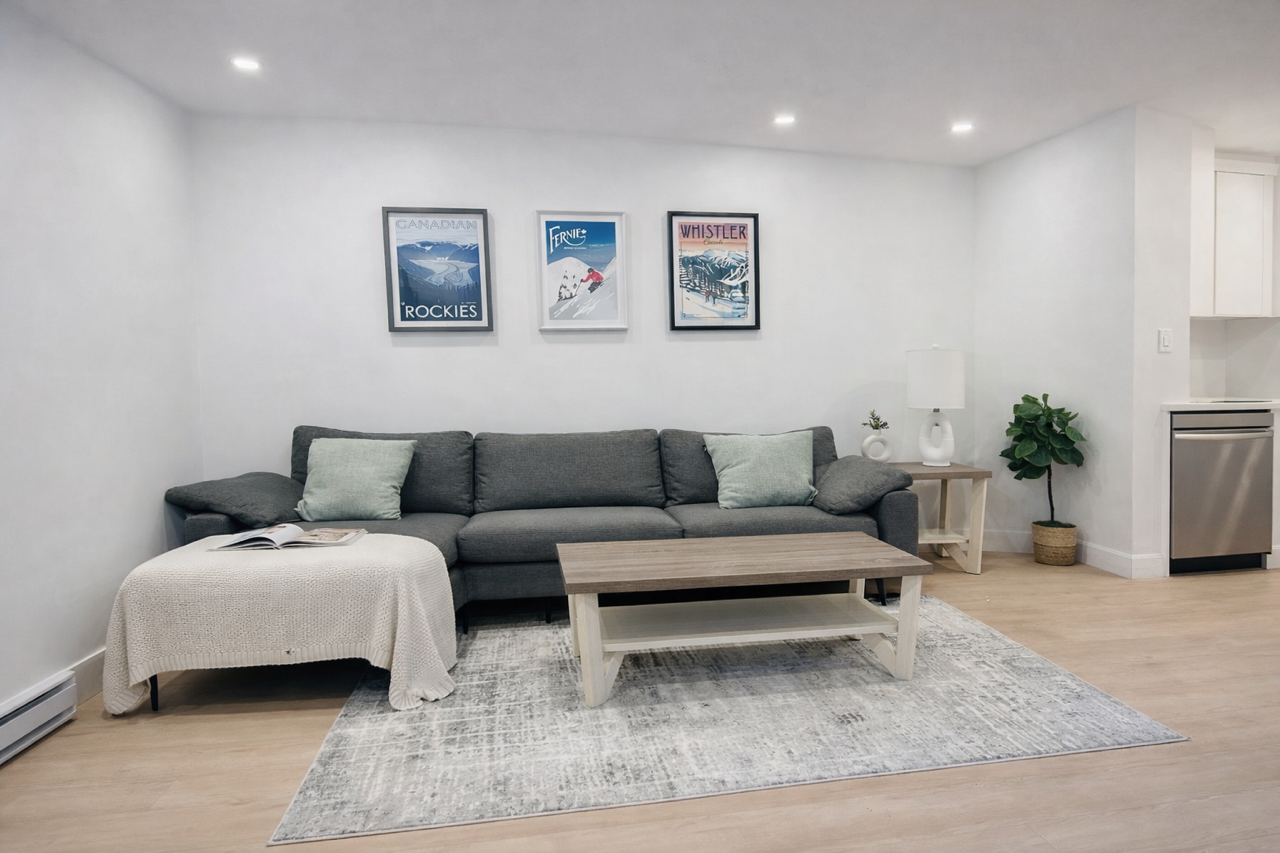 Fully Furnished with parking. Beautifully situated in Central Lonsdale, live in North Vancouver’s trendiest and most convenient neighborhoods. With a walk score of 78 and a bike score of 84, life is convenient and active. New spacious basement suite with over 700 sq ft of living space. The unit is fully furnished and well equipped, including all the details from artwork, new bedding, linens, towels and cookware. All you need is your luggage, everything else is provided. Relax on the large sectional couch while enjoying your favorite show on a 55” smart TV. . The kitchen is fully equipped with kitchenware, cookware, quartz countertops for work or dinner prep along with brand new appliances! After a busy day, snuggle up into your fresh silk and snow linens and mattress, in a queen size bed. There is parking available on Keith Road. This unit is available April 1, 2026 and although the term is flexible, preference is given to longer stay guests. A standard BC lease is required to be signed and renters insurance obtained (about $20/month). A $200 cleaning will be applied at lease signing for professional cleaning services. Dogs considered on a case by case basis, sorry no cats. Please note this unit is a fully permitted and purpose-built basement suite, with its own entrance and sound resistant with special insulation and a concrete layer separating the basement from the main house. We live in the house above and proudly manage the suite.