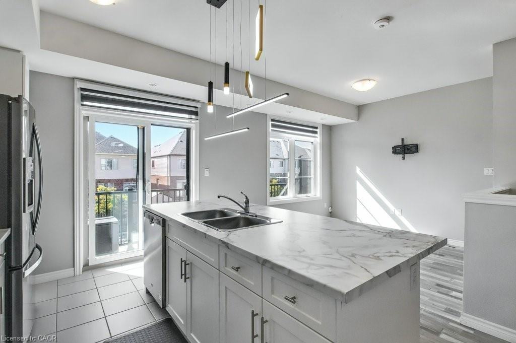 The townhouse has 1,200 square feet of living space. The main level features a great room, a kitchen with stainless steel appliances, a 2-piece bathroom, and in-suite laundry. The main level also has a large balcony for outdoor living. The upstairs level has a primary bedroom with a 3-piece ensuite and a private balcony. The upstairs level also has a second bedroom and a 4-piece bathroom. The townhouse is located in the heart of Wallaceton, close to RBJ Schlegel Park and various amenities. The neighbourhood offers a mix of community greenspace, playgrounds, shops, restaurants, and top-rated schools. Available immediately