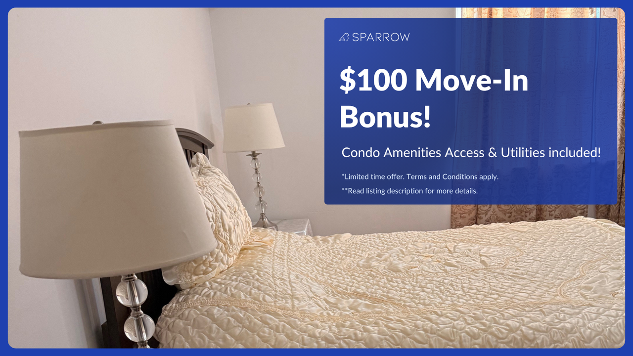 Text me at 437 291 7980 for assistance using SparrowShare Online App Request a tour for this private room for rent at sparrowshare. com Private room for rent in a shared 3BR Condo unit at Lawrence Avenue E Bedroom available: 1 Furnished Bedroom A: $880 Private room with Queen sized bed (Shared bathroom) Solo occupant only Utilities included: - Air Conditioning - Washer & Dryer - Heating - Internet - Cable TV Condo Amenities Included: - Swimming Pool - Gym - Sauna - Elevator Shared spaces: - Bathroom - Kitchen - Dining Room - Living Room - Backyard Parking: On Premises Minimum Rent Duration: 6 months Payment: After a tour and signing the agreement, Pay a security deposit and First month's rent before move in-date Address: Lawrence Ave E, Scarborough, ON M1E 4V5, Canada *For home safety precautions, Exact Address will be shared after a scheduled tour House Rules: - No Guests - No Smoking/Vaping/Cannabis - No Pets Allowed Additional Benefits: - Credit Building - Tenant Insurance Included Disclaimer: This listing has been syndicated from sparrowshare.com, including its content, rental terms, and images. Sparrow is used to verify the identity and compatibility of those interested. The advertised property is owned and/or managed by Melvin from Sparrow Living Inc.