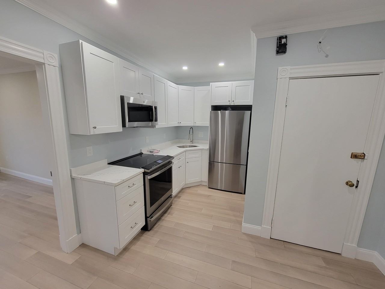 - Classic white shaker-style cabinetry