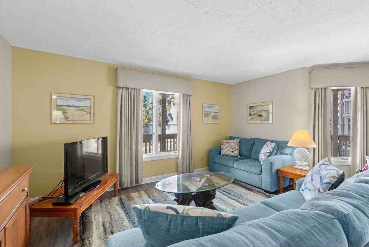 The advertised rate of $2,493/month is the lowest available price, based on a 30 day(s) stay with a move-in date of October 15, 2026. Rates vary depending on the duration of stay, season, and other parameters. For exact pricing and additional pricing components, please visit our website and enter your desired move-in and move-out dates. The rate is applicable when billed upfront; it can be higher if billed in multiple payments. Feel at home in this spacious 2-bedroom, 2-bath condo in Myrtle Beach, offering comfort, convenience, and a prime location. This comfortably furnished condo features an open-concept layout with a cozy living area, a dining space with seating for six, and a fully equipped kitchen. The first bedroom includes a double bed and a twin with private access to the balcony with views of the pool deck. The second bedroom includes two twins. Enjoy your morning coffee or evening breeze on the large wraparound balcony in the front, or unwind on the private balcony off the bedrooms that is steps from the pool. Linens, bath towels, hand towels, and washcloths are provided. The kitchen is equipped with essential supplies like a roll of paper towels, hand soaps, two dishwasher pods, and two laundry pods. The bathrooms are stocked with two rolls of toilet paper each. Don't forget to bring your own beach and pool towels. Located directly across the street from the public beach access at 29th Avenue North in Myrtle Beach, this condo is super close to all that Myrtle Beach has to offer both on the water and land. There is a Starbucks/Ben and Jerry's across the street, the renowned Sea Captain's house with ocean front bar is a 3-block walk away, and you will be less than 1 mile from Broadway at the Beach, the Myrtle Boardwalk, Myrtle Beach Convention Center, and Top Golf. A car is recommended, but you can also walk several places, making it easy to leave your car in the lot for most of your stay. There is also a bike lane on both sides of the street for cyclists of all types. Uber is available in the area but can be limited at times. Guests must be at least 25 years old to book. This is a non-smoking property, and pets are not allowed. Check-in time is at 4:00 pm, and check-out is at 10:00 AM. The maximum occupancy for this property is 6 people, including infants and children. Quiet hours are between 11:00 PM and 7:00 AM.