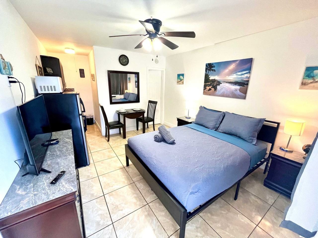 The advertised rate of $2,201/month is the lowest available price, based on a 30 day(s) stay with a move-in date of May 4, 2026. Rates vary depending on the duration of stay, season, and other parameters. For exact pricing and additional pricing components, please visit our website and enter your desired move-in and move-out dates. The rate is applicable when billed upfront; it can be higher if billed in multiple payments. From championship match days to high-energy race weekends, feel at home in this beach-adjacent studio that puts you right where Hollywood comes alive. Whether you’re visiting for the world-class tennis tournament, Spring Break, Formula 1, or the upcoming World Cup, this modern studio offers a comfortable, centrally located base to recharge between unforgettable moments. This is a true open-concept studio, with sleeping and living areas combined into one space. Designed for flexibility and momentum, this open-concept studio is ideal for guests who plan to be out exploring by day and unwinding in comfort by night. Bright interiors, clean lines, and a functional layout make it easy to transition from beach mornings to event-filled evenings. It features a dining table suitable for meals, planning the day’s events, or remote work. The fully equipped kitchen has modern cabinetry, granite countertops, a gas stove, microwave, and full-size refrigerator. The updated bathroom includes fresh towels and essential toiletries. Enjoy high-speed Wi-Fi and efficient air conditioning for year-round Miami comfort. Located in a quiet residential area with easy access to Miami’s most iconic venues and attractions, including beautiful nearby beaches, dining, nightlife, and entertainment districts. Major roads and public transportation provide easy event access, and everyday conveniences are available for extended or high-energy stays. Getting around Miami is simple from this location. Guests can drive, use rideshare services like Uber and Lyft, or access public transportation nearby. Short trips connect you to stadiums, event venues, beaches, and nightlife. The apartment is located in a residential neighborhood, so quiet hours are observed from 8:00 to 22:00. Parties and events inside the unit are not permitted.