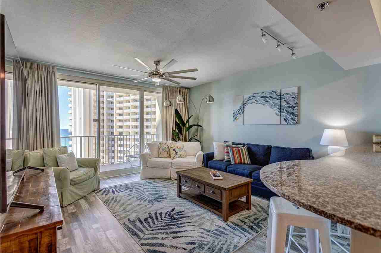 The advertised rate of $5,032/month is the lowest available price, based on a 30 day(s) stay with a move-in date of October 20, 2026. Rates vary depending on the duration of stay, season, and other parameters. For exact pricing and additional pricing components, please visit our website and enter your desired move-in and move-out dates. The rate is applicable when billed upfront; it can be higher if billed in multiple payments. Feel at home in this 2-bedroom plus bunk room apartment, unit 1118, located on the 11th floor of the 23-story Shores of Panama luxury resort in the heart of Panama City Beach. This modern home offers stunning Gulf-front views and is professionally managed by a trusted partner, ensuring peace of mind during your stay. Step into the kitchen, featuring granite countertops and an eat-in island with four barstools. The open layout provides direct views of the beach, and the kitchen is fully stocked with everything needed for morning coffee or a gourmet meal. The living area offers comfortable furniture, a queen sleeper sofa with an upgraded gel mattress, and a large flat screen TV perfect for movie nights. The master bedroom features a king-size bed, its own flat screen TV, and an en-suite bathroom. The guest room has a queen-size bed and a large flat screen TV. A bunk room with twin beds is just steps from the second shared bathroom. Enjoy beautiful sunsets or morning coffee from the private balcony. The resort offers over 14,000 square feet of indoor and outdoor pool space with hot tubs, a modern fitness center with brand new equipment, and two poolside Tiki bars. Beachside activities, water-sports, and chair and umbrella rentals are also available on site. Enjoy the convenience of a reserved, covered parking space located on the same floor as the apartment. Access to resort amenities, including wristbands for pools and hot tubs, and additional parking permits, requires a one-time fee of $90 paid to the concierge in the lobby for a registration packet. Centrally located in the heart of Panama City Beach, this apartment is just steps away from Walmart, directly across the street. You are moments away from Pier Park, Panama City's premier shopping and dining area, and Pineapple Willy's Beachfront Bar is also just steps away. Explore nearby attractions such as Ripley's Museum, Signal Hill Golf Course, mini golf, and numerous restaurants. For families, Cobra Adventure Park and Shipwreck Island Waterpark offer exciting activities, and you can enjoy a bird's-eye view from the Skywheel gondola or play mini-putt golf. Please be aware that Shores of Panama is currently undergoing exterior construction, which may cause loud and disruptive noise between 8:00 am and 5:00 pm. Pets are not allowed. Smoking is not permitted. Check-in is at 4:00 pm central time, and check-out is at 10:00 am central time. The registered guest booking and occupying the apartment must be 25 years of age or older. Any booking made within 48 hours of arrival will require a credit card and matching ID on file. Failure to comply with the age requirement or booking under false pretenses will result in the cancellation of the reservation and potential eviction, with no refund. This apartment is remote work-friendly, featuring a private Wi-Fi connection with a 100+Mbps download speed, making it easy to stay connected with colleagues while on vacation. Registration Number: 71044