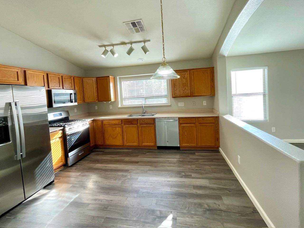 Rent $1,750 / Monthly Admin Fee $82 / Security Deposit $1,750 / Move in Fee $350 / Annual Pet Fee $100 / Pet Deposit $250 per pet. Experience refined comfort and effortless living in this beautifully appointed single-story residence, thoughtfully designed with both style and functionality in mind. Freshly enhanced with new interior paint, the home showcases a bright, modern aesthetic complemented by wood-look flooring throughout, creating a seamless flow from room to room. The expansive kitchen serves as the heart of the home, featuring sleek stainless steel appliances, abundant cabinetry, generous counter space, and a dedicated dining area perfect for casual meals or morning coffee. Offering three spacious bedrooms and two well-appointed bathrooms, this home provides both privacy and comfort. The serene primary suite is a true retreat, complete with a walk-in closet, dual-sink vanity, and an oversized walk-in shower designed for relaxation. Designed for both entertaining and everyday living, the home features a formal living room and a separate family room, offering versatile spaces to host gatherings or unwind. The family room opens seamlessly to the kitchen, creating an inviting, open-concept atmosphere ideal for modern living. Ceiling fans throughout all bedrooms and living areas enhance comfort year-round, helping maintain a cool and pleasant environment. Embrace the best of indoor-outdoor living with a covered patio for shaded relaxation and an extended uncovered patioperfect for outdoor dining, entertaining, or enjoying peaceful evenings under the open sky. This home effortlessly combines spacious design, contemporary finishes, and inviting living spacesan exceptional opportunity for those seeking both elegance and comfort. Owner will consider pets, call for details.