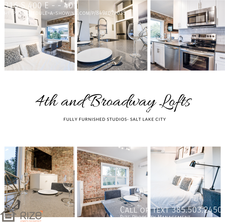 The thoughtfully designed studios have a full kitchen with full sized oven/range, microwave, refrigerator, and dishwasher. Each apartment comes with a front-loading washer & dryer to use at your leisure. Built-in seating at your quartz countertop with plenty of room for food prep. High-speed Internet so you can stream and game without any buffering. There is also a surprising amount of storage! All you need to do is show up with your clothes because these studios are fully furnished with a queen sized bed and mattress, kitchenware, high definition smart TV and even art on the walls. You will be impressed with the exposed brick accented studio apartments. These homes combine the charm of a classic brick building with all the modern features. The new triple pane windows and brand new energy efficient heating/air conditioning mini split system will keep you cool in the summer and warm in the winter all while keeping your bills low. Easy to tour, call 385-503-2450 View our video tour on Instagram- https www instagram com reel C6_-HGvu9dQ ?utm_source=ig_web_copy_link&igsh=MzRlODBiNWFlZA== Resident is responsible for renter’s insurance & all utilities including: -$60 per month for water, sewer, garbage, and common area gas. -$65 per month for 150mbps high-speed internet -$25 per month for common area maintenance -$11 per month utility billing fee -$65 Designated Parking (Parking is limited, please contact Rize for availability) -Gas and Electric will be billed based on usage Animal friendly, up to 2 animals maximum. Pet deposit and monthly pet rent per pet. Breed restrictions will apply Move in Fees- $250 non-refundable cleaning fee $275 non-refundable lease initiation fee $350 refundable deposit – this amount may vary based on application screening results Photos are of a similar apartment and not necessarily the exact apartment available for rent. Please inquire with scheduling a tour when home comes available! ***PARKING IS SUBJECT TO AVAILABILITY DUE TO LIMITED SPACE. Move in specials apply only to certain apartments. Please inquire with our office for more information Photos are of a similar home and not necessarily the exact home available for rent. Please inquire with scheduling a tour when home comes available! All information contained in this advertisement is deemed reliable but is not guaranteed. Applicants are solely responsible for verifying the accuracy and completeness of all details provided.